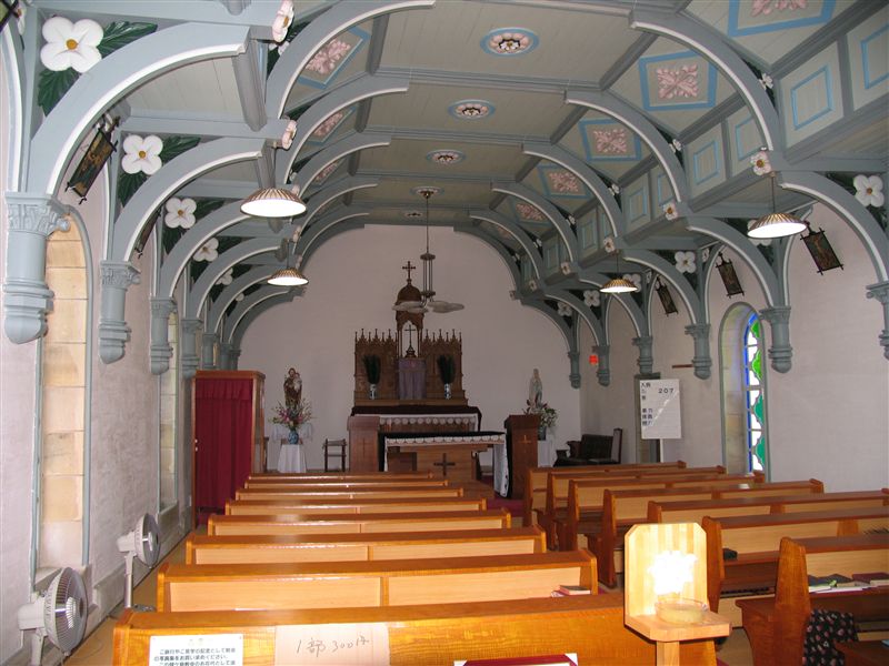 スの御心像」が両手を大きく広げて迎え入れてくれる。コウモリ天井、ステンドグラスは5つの花びらをデザイン化。柱は4本をまとめたよう