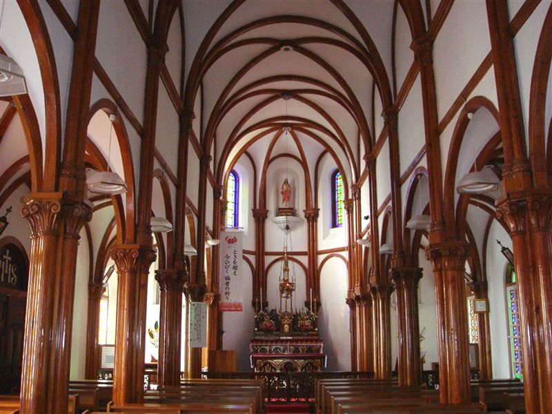 奈摩湾を見下ろすように高台に建っている。レンガ造りの大きな教会で、コウモリ天井と複雑な模様のステンドグラスが美しい。光の加減で床やベンチに映る色の模様はAosagaura格別。木の柱に施された装飾も豪華である。正面祭壇下に「最後の晩餐」のレリーフがはめ込まれてある。内装同様に正面外壁の葡萄をあしらった石造りのアーチなどにも注目したい。