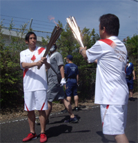 | 聖火受け渡しセレモニー 第1区のオリンピックランナー田端健児君と2区の中村格青小元校長との聖火受け渡し |